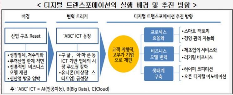 현재 디지털 트랜스포메이션은 첨단제조기술·ICT 등 기술 적용과 프로세스 효율화에서 더 나아가 비즈니스 모델 변혁과 생태계 구축까지 확장해 실행되고 있다.